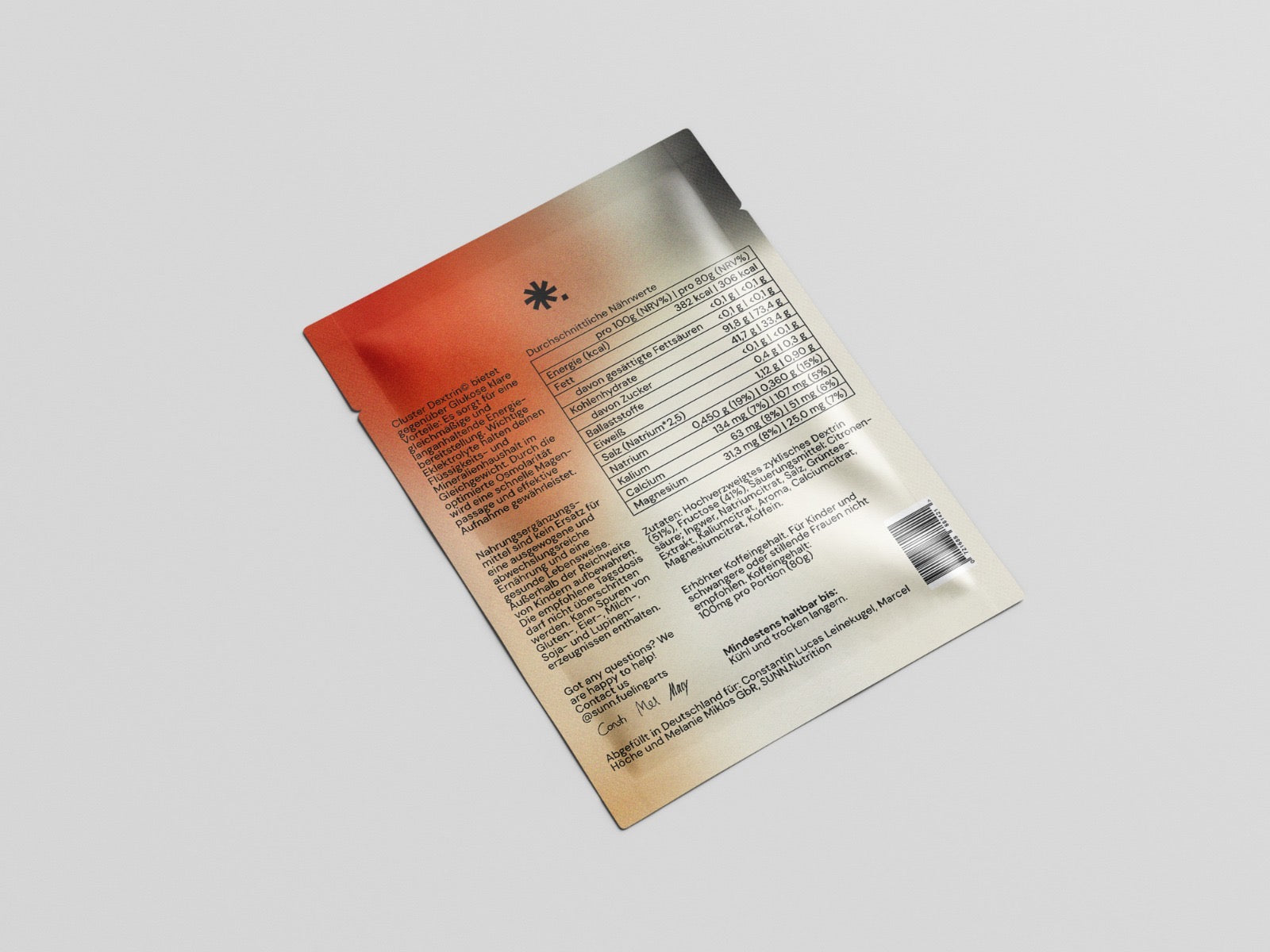 Jeder Beutel versorgt dich mit rund 79g Kohlenhydrat, 330mg Natrium, 150mg Kalium, 40mg Calcium, 15mg Magnesium, 100mg Koffein und 200mg L-Theanine aus Grünteeextrakt.